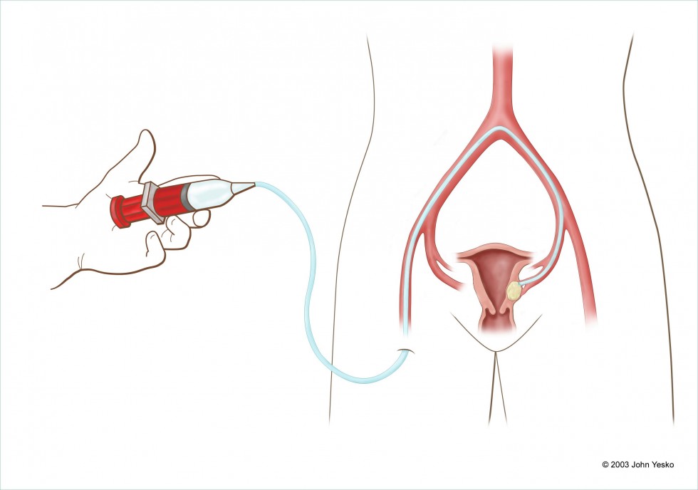 Uterine artery embolization is an established, safe and effective treatment for uterine hemorrhage that accompanies a number of conditions like post-partum bleeding, tumors, arterio-venous malformations, and pre-operatively for decreasing blood loss during surgery. Large groups of patients in France and at UCLA in California have undergone uterine artery embolization for treatment of symptomatic uterine fibroids. The results are extremely encouraging. Uterine artery embolization is a non-surgical procedure for the treatment of symptomatic uterine fibroids. It is a minimally invasive procedure preformed under local anesthesia and sedation. The sedative effects of the medications will make you drowsy. The purpose of uterine artery embolization is to block the blood supply that feeds uterine fibroids, thus starving it of its nutrients. Blocking the blood supply or “embolization” of the uterine artery results in shrinkage of the fibroid growths. During uterine artery embolization, a small catheter is inserted into a blood vessel in your groin and threaded into the arteries to your uterus. Tiny particles pass through the catheter and wedge in the small vessels, blocking the blood flow to the fibroid. In the majority of patients, the fibroid will shrink substantially, resulting in alleviation of symptoms. Fibroid embolization usually requires a hospital stay of one night.
